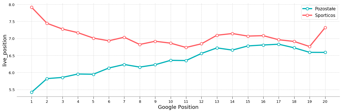 Z wykresu dla wszystkich wyników wynika, że im bliżej początku title znajduje się słowo live tym większa szansa na pojawienie się w wynikach. Różnice nie są tu jednak znacząco. W przypadku Sporticosa ta zależność jest odwrotna i wynika z faktu, że serwis naszego klienta częściej osiągał czołowe pozycje dla faz dłuższych (z długiego ogona zapytań).