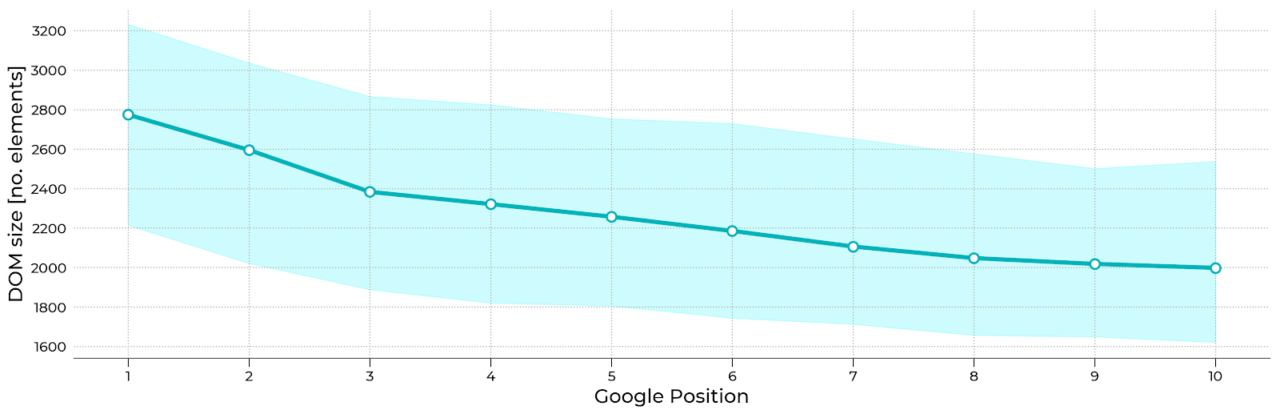 - DOM Size - Mimo że Google sugeruje unikanie większych rozmiarów DOM, wyniki pokazują, że landing pages z większą liczbą elementów w drzewie dokumentu pojawiają się wyżej w wynikach wyszukiwania.