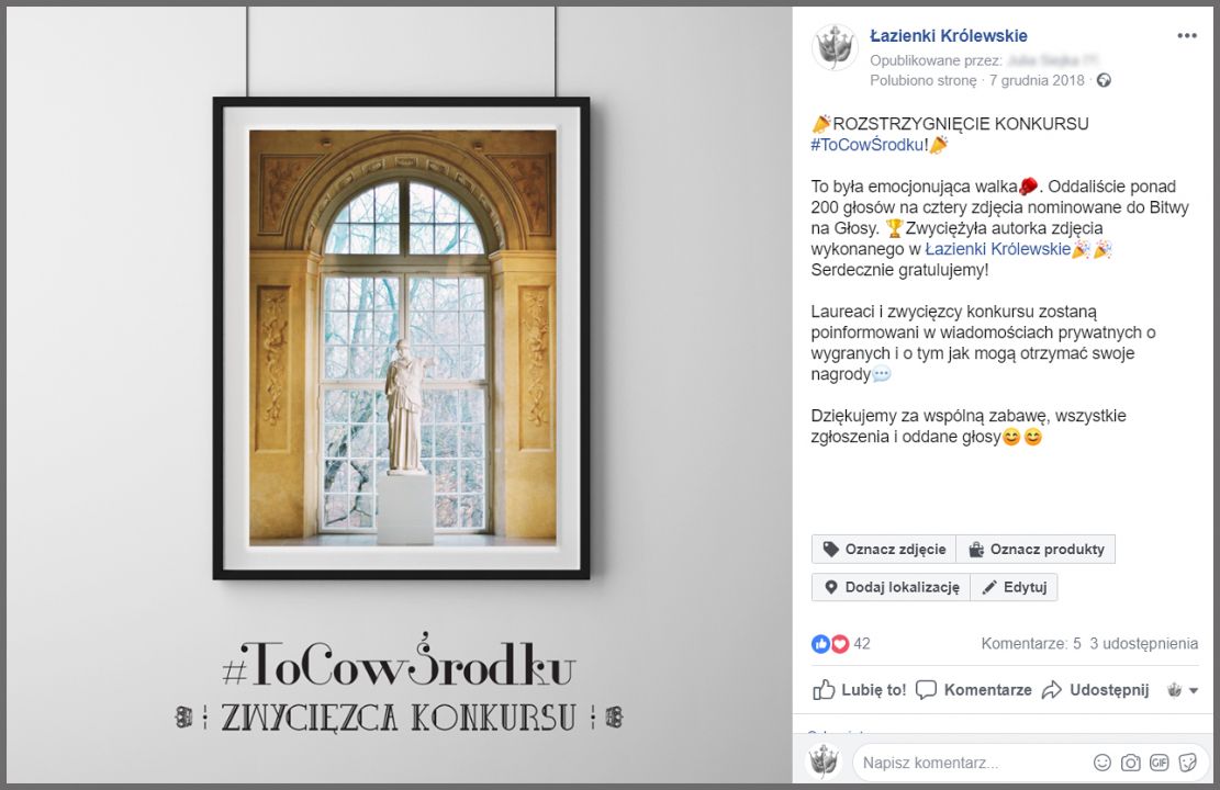 Na podstawie analizy zachowań użytkowników profili Łazienek Królewskich wybraliśmy najwygodniejszą, najchętniej stosowaną przez nich formę - konkurs oparty na fotografiach. Widzieliśmy, że taka forma ma szansę przynieść pożądane efekty i odnieść sukces. Konkurs opatrzyliśmy hasztagiem #ToCowŚrodku, który w kilku prostych słowach określał dokładnie to, o co nam chodziło - o pokazanie swoimi oczami ukrytego piękna, o wnętrza i świadome konsumowanie sztuki.