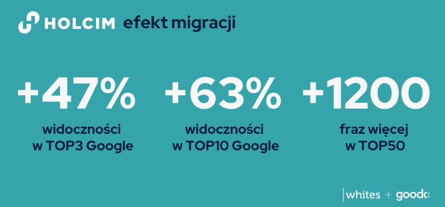 - Bezpieczeństwo w procesach krytycznych (migracje i rebranding): B2B to często wieloletnia historia marki i ryzykowne zmiany technologiczne. Whites udowodniło swoje kompetencje, realizując migrację i rebranding giganta budowlanego Lafarge w Holcim. W procesie, który dla wielu firm kończy się spadkami, Whites nie tylko zabezpieczyło ruch, ale doprowadziło do wzrostu widoczności o 63% po migracji. To dowód na to, że są partnerem do kompleksowych zadań specjalnych, łączącym SEO techniczne ze strategią komunikacji zmiany marki. Przeczytaj case study: link